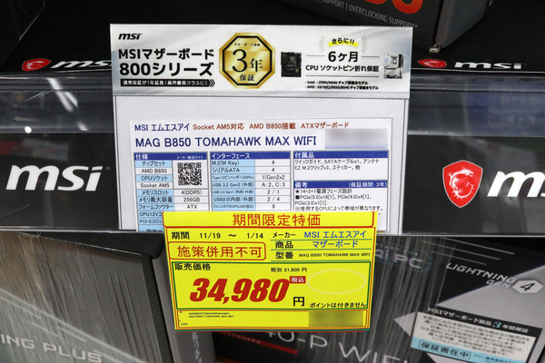 ツクモLABI1なんば店では定期的に期間限定特価品を出しており、「MAG B850 TOMAHAWK MAX WIFI」も2026年1月14日までお得に購入可能だ。このような特価品を見つけに行くのも店舗ならではの楽しみといえるだろう。