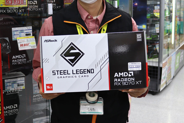 ビデオカードの売れ筋を聞くと、販売数的にはASRock「Radeon RX 9070 XT Steel Legend 16GB」とSAPPHIRE「SAPPHIRE PULSE Radeon RX 9070 XT GAMING 16GB GDDR6」で人気を二分しているという。両者ともリーズナブルな価格帯で、白色で組むならSteel Legend、黒色で組むならPULSEといった棲み分けになっているそうだ。