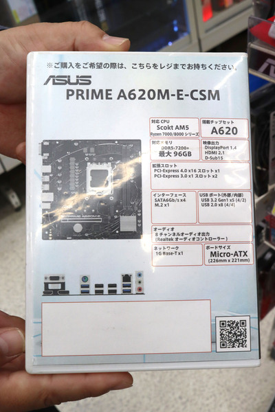 マザーボードの売れ筋に関しては、単純に売れた数で考えると1万円台前半で購入できる格安マザーボードの売れ行きが大きいとしている。その一例としてASRock「B850M-X WiFi R2.0」やASUS「PRIME A620M-E-CSM」を挙げていた。その他のマザーボードについては、各お客さんの需要がバラけていて、突出して売れる製品はあまり出てこないようだ。