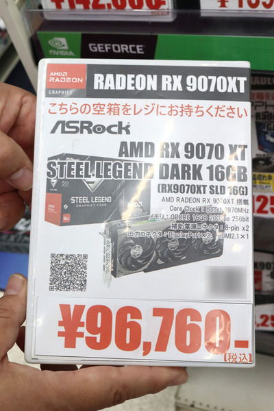ASRock「Radeon RX 9070 XT Challenger 16GB」が品切れのため、今回は次点のASRock「Radeon RX 9070 XT Steel Legend Dark 16GB」を売れ筋製品とした。こちらも比較的安価な「Radeon RX 9070 XT」搭載ビデオカードとのことで、店頭価格が売れ行きに与える影響はかなり大きいことがうかがえる。