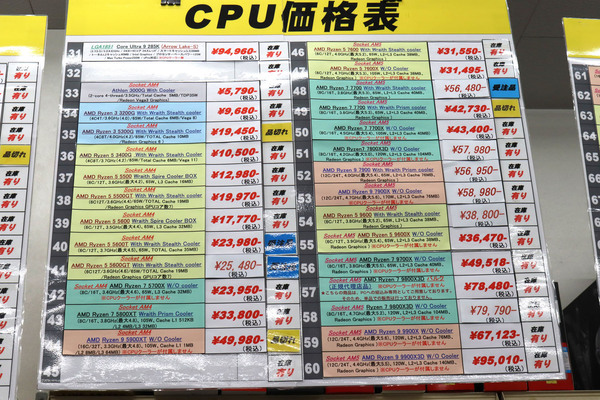 CPUの売れ筋は、価格と性能のバランス、つまりコスパに優れた「Ryzen 7 9700X」が一番の売れ筋になっている模様。ここより上のハイエンドクラスは、もうある程度欲しい人に行き渡ったのか落ち着いた動きになっているようだ。Socket AM4のCPUについても、アップグレード需要は少しあるものの、目立った動きがあるほどではないという。