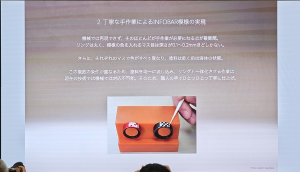 特に、丸いリングに0.1~0.2mmほどの深さしかないマス目に色を流し込み、均一に仕上げる作業は、現在の機械技術では不可能であり、職人の手によってひとつひとつ丁寧に仕上げられています。この品質を追求した結果、発表から製品化まで8ヵ月かかったとのこと。