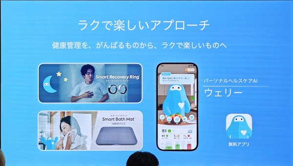 計測されたデータは専用の無料アプリで確認でき、そこにはパーソナルヘルスケアAI(人工知能)の「ウェリー」が搭載されています。ウェリーは、自分の健康データと連携し、そばで見守るパートナーのように、楽しみながら健康習慣をサポートしてくれます。