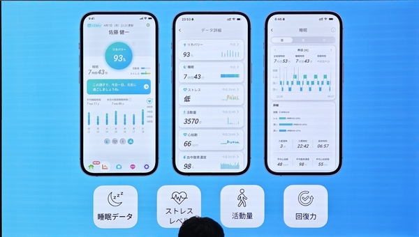 たとえば、眠りに入ったら自動的に音楽を消してくれる「おやすみサウンド」や、眠りの浅いタイミングで優しく起こしてくれる「おはようサウンド」といった機能があり、良い眠りに入るための手助けをします。ストレスレベルをモニターし、ストレスが高い状態が続くと、「コーヒーブレイクはいかがでしょう」といった提案して、ストレスを解消するきっかけを与えてくれます。また、スイカゲームのエクササイズ版も搭載されています。