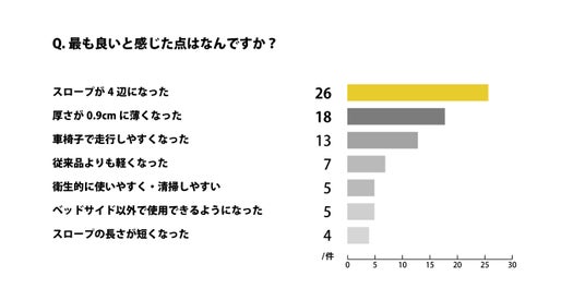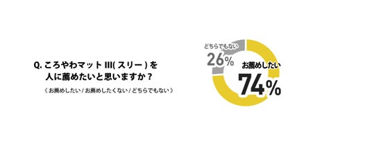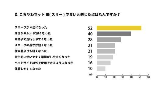 尚、78の病院・介護施設にて、今回の最新作『ころやわマットIII』を有償モニター品にてお試しいただいたところ、10点満点で平均7点以上という高評価をいただきました。また、「お薦めしたい」と回答いただいた割合も7割を超え、多くの方に支持をいただいております(「お薦めしたくない」の回答は0件)。特に評価ポイントが高かったのは、「スロープが4辺になった」「薄くなった」「車椅子で走行しやすくなった」という点で、さらに使いやすくなったころやわマットを医療・介護のプロから高く評価いただいております。