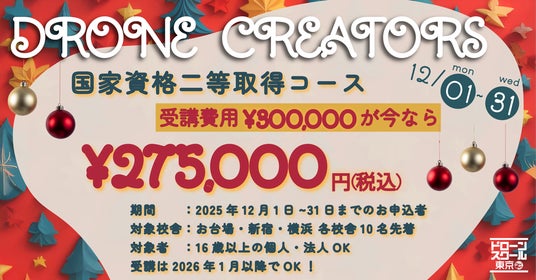 ドローンスクール東京を運営する株式会社ハミングバード(東京都渋谷区、代表取締役:鈴木 伸彦)は、ドローン国家資格(二等無人航空機操縦士)の取得を目指す方を対象に、受講料を25,000円割引する「国家資格二等取得コース 応援キャンペーン」を2025年12月1日(月)より開始いたしました。
