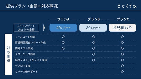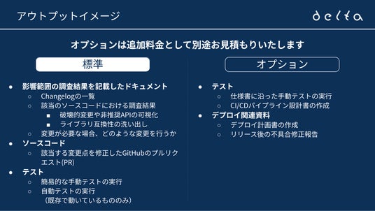 これら言語/ フレームワークのアップデートをDELTAが対応。依存ライブラリやツールも含めて一括でサポートすることによってお客様の安全なシステム運用を確保、さらには信頼性・保守性を向上させることで今後の開発・運用がしやすい環境を提供いたします。(※本キャンペーンで申し込みをいただき、諸条件を満たしたお客様には20%割引が契約期間中適用されます)。
