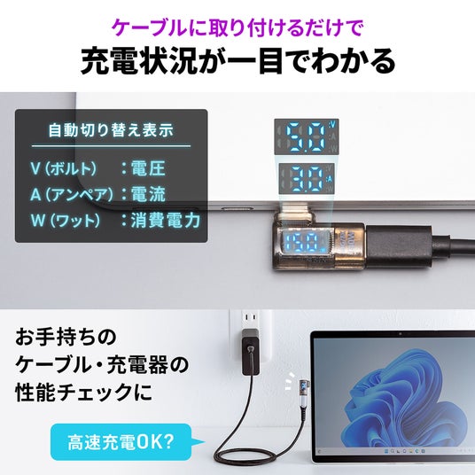 高速充電が本当にできているのか、ケーブルや充電器の性能が活きているのか――そんなモヤモヤを解消するのが電力表示機能です。本製品はケーブルに挟むだけで、V(電圧)/A(電流)/W(消費電力)を順に自動表示。数字で確認できるから、充電トラブルの切り分けや性能チェックにも役立ちます。