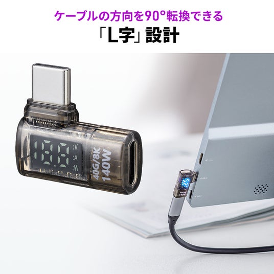 USB-C 変換アダプタ L字 電力表示機能 USB 40Gbps PD 140W 映像出力 8K 60Hz L型 方向変換 Type-C クリアカラー スケルトンデザイン