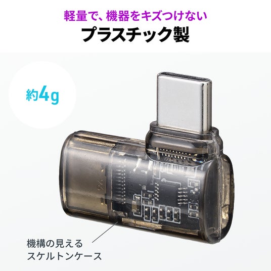 約4gの超軽量・コンパクト設計で、ポーチやガジェットケースに忍ばせても邪魔になりません。プラスチック製で機器を傷つけにくく、幅約3mmでスマホケース装着時にも対応。中の基板が見えるスケルトンデザインは、ガジェット好きの心をくすぐる“見せたくなる”デザインです。