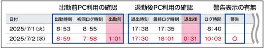 「ジンジャー勤怠」を通して取得した出退勤情報と、「MaLionCloud」で取得したPCの操作ログを突合し、乖離があれば、警告を表示することが可能です。