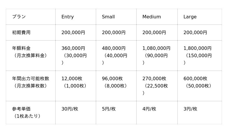 Create!Form Cloud は、年間の出力枚数に応じたシンプルな料金体系で、少量利用から大規模な運用まで、業務に合わせて幅広く柔軟に対応します。