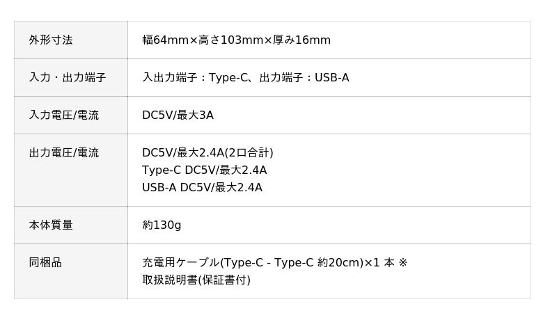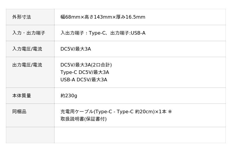 スマートフォン約2回分(*4)の充電が可能。約230gで、旅行や外出先でも安心して使える大容量タイプです。