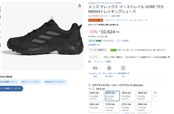 39%引きにまでなるのは26.0cmですが、25.0cmや25.5cmが31%引きなど、複数のサイズで割引されています。「防水GORE-TEXのトレッキングシューズが欲しいけど、値段がネック……」という人も多いと思いますが、冬のアウトドア用に1足そろえるなら今がちょうどいいタイミングです。