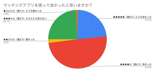 一方で、星2つ以下の評価をつけている人の中には、デートはしたが相手が体目的で嫌な思いをしたり、アプリ上でマッチングしてやり取りはできても実際のデートに繋がらなかったとの声も。ただしこうしたネガティブな評価も合計でわずか2.9%に留まり、多くのユーザーが満足していることが明らかになりました。