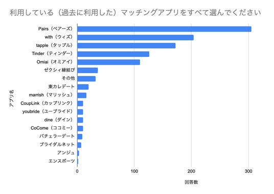 使ったことがあるアプリとして最も多く名前が挙がったのはPairs(ペアーズ)で305名。次いでwith(ウィズ)204名、tapple(タップル)172名と続きます。