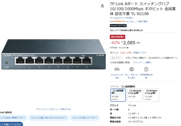 9月頃には2,790円から9%OFFの2,535円として販売されていたTP-Link ギガビット対応 8ポート スイッチングハブ「TL-SG108」ですが、今回は元値(参考価格)が3,599円と設定が変わり、そこから42%引きという形になっています。とはいえ、現在の販売価格2,085円が、かつてより安い事に変わりなく、かなりお得な価格設定と言えるのではないでしょうか!