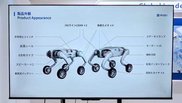 Pudu Roboticsは12月3日、東京ビッグサイトで開催された「国際ロボット展」にて産業向けに設計された自律型4足歩行ロボット「PUDU D5」シリーズを披露した。同社といえば、ファミリーレストランなどで見かけるネコ型配膳ロボット「BellaBot」でおなじみだが、今回の新製品は打って変わって無骨でタフな産業用モデルだ。複雑な地形や過酷な環境下での業務自動化を目指し、純粋な4足歩行モデル「PUDU D5」と、車輪と脚を組み合わせたハイブリッドモデル「PUDU D5-W」の2種を展開する。