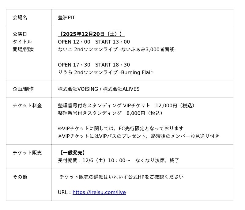 株式会社VOISING(本社:東京都港区、代表者:ないこ、以下、VOISING)所属の2.5次元アイドルグループ「いれいす」メンバーのりうら・ないこのソロアルバム『IGNITE』(りうら)『Dream’n Rouge』(ないこ)を本日2025年12月3日(水)に同時リリースいたしました。メンバーそれぞれの個性と表現力に光を当てる2ndソロアルバムの第1弾・2弾となるりうら・ないこのソロアルバムは、それぞれの世界観を濃密に描き出した作品に仕上がっております。さらに、両名のソロアルバム発売を記念し、2025年12月20日(土)には豊洲PITにて両名のソロワンマンライブを開催いたします。