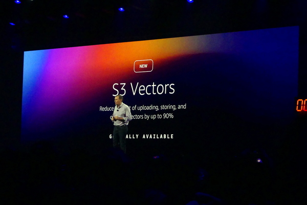 セマンティック検索やコンテキスト理解で重要なベクトルデータの保管や検索を可能にするAmazon S3 Vectorsも一般提供が開始された。対応ベクトル数はプレビュー時の40倍となるインデックスあたり20億となり、バケットあたりで20兆ベクトルまで拡張された。頻繁に実行されるクエリのパフォーマンスも2~3倍高速化し、他に比べてコストも最大90%削減。AIアプリケーションの開発を寄与するという。
