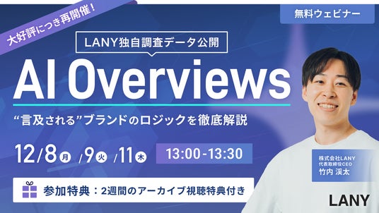 デジタルマーケティング支援を提供する株式会社LANY(東京都渋谷区、代表取締役社長:竹内渓太)は、【無料ウェビナー】【大好評につき再開催】LANY独自調査データ公開!AI Overviewsで “言及される” ブランドのロジックを徹底解説 を12/8(月)~12/11(木)に開催いたします。