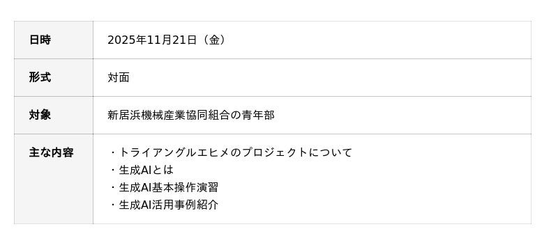 当社は、愛媛県が推進する「トライアングルエヒメ2.0」において『ものづくり企業におけるAI開発の内製化とAI人材育成プロジェクト』が採択されており、その取り組みで得た知見を地域企業にも還元すべく、えひめ東予産業創造センターと連携し、新居浜機械産業協同組合の青年部に向けて、トライアングルエヒメの取り組み紹介を含む生成AI勉強会を実施しました。