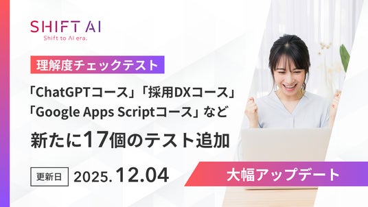「日本をAI先進国に」を掲げAIのビジネス活用を学べる利用者数No.1※の生成AI学習コミュニティ「SHIFT AI」を運営する株式会社SHIFT AI(東京都渋谷区、代表取締役 木内翔大、以下当社 )が2025年8月より提供開始した、法人向けリスキリングサービスSHIFT AI for Bizのオンライン学習プラットフォームにおいて、受講後の理解度を定量的に測定できる「理解度チェックテスト」機能を大幅にアップデートしたことをお知らせします。今回のアップデートではツール別コース、職種別コース、価値別コースなど、新たに17コースの理解度チェックテストを追加しました。受講者は受講直後にテストを受けることで自己理解度を確認でき、管理者は学習効果の把握と次の研修計画策定に活用できます。