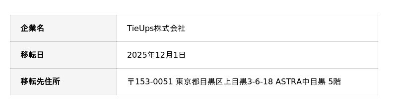クリエイターデータによる共創・コラボレーション事業を展開するTieUps株式会社(本社:東京都渋谷区、代表取締役:小原 史啓、以下「当社」)は、事業拡大および組織成長に伴い、中目黒へのオフィスを移転いたしましたのでお知らせいたします。