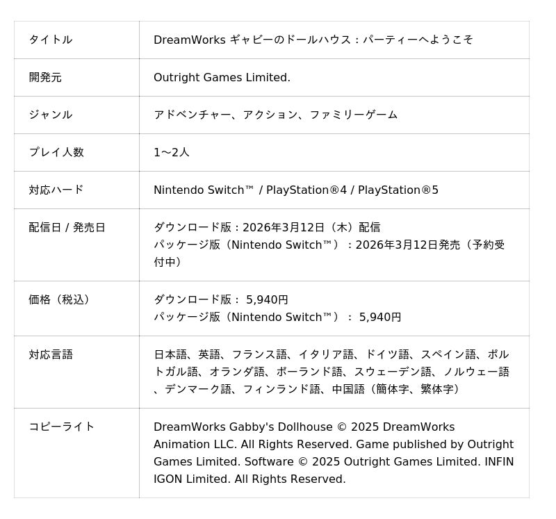 株式会社Phoenixx(フィーニックス)(東京都武蔵野市、代表取締役社長:坂本 和則)は、アドベンチャーゲーム『DreamWorks ギャビーのドールハウス:パーティーへようこそ』について2026年3月12日(木)よりNintendo Switch(TM) / PlayStation(R)️4 / PlayStation(R)️5向けに、販売を開始することをお知らせいたします。