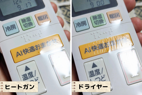 左がヒートガンで、右がドライヤー。ボタン部の張りが全然違います