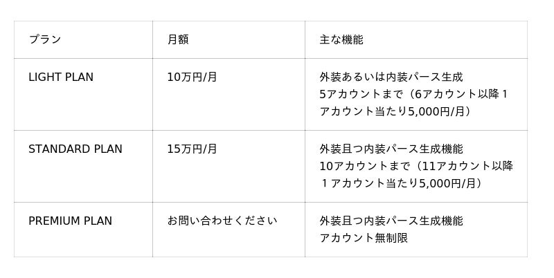 本サービスは、不動産・建築業界において従来10~40万円以上・2週間以上を要していた3Dパース制作を、月額10~万円から2分程度で生成することができる日本初のAIシステムです。回数制限は無制限となっておりますので何回でも3Dパースを生成可能です。