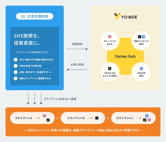 SNS・ARプロモーションを手がける株式会社YONDE(本社:福岡市中央区、代表取締役:田坂 洋一)は、広告代理店向けデジタル企画・制作サブスクリプションサービス「YONDE パートナーパック」の提供を開始します。