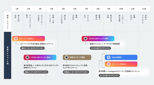 エンタメ系のクライアントCには、新作映画にあわせたWebAR × Instagram投稿キャンペーンや、アーティストの新曲プロモーション向けエフェクトキャンペーンを実施するなど、年間を通じて多様な企画を柔軟に展開できます。