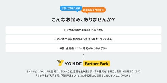 「YONDEパートナーパック」は、広告代理店の提案力を拡張する月額制のデジタル支援サービスです。
