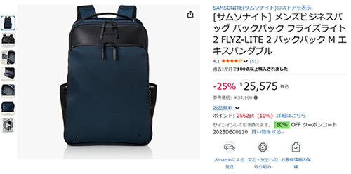 スーツケースで有名なサムソナイト(Samsonite)の人気メンズビジネスバッグ 「FLYZ-LITE 2 バックパック M」が、Amazonセールに登場!