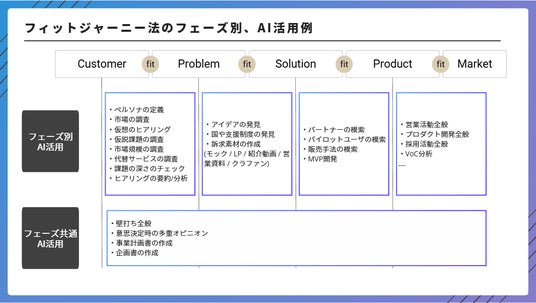 - AI×新規事業の重要事項:新規事業における課題解決を「フィットジャーニー法」をベースに、各フェーズでAIが具体的にどのように活用できるかの事例とプロンプトを解説。