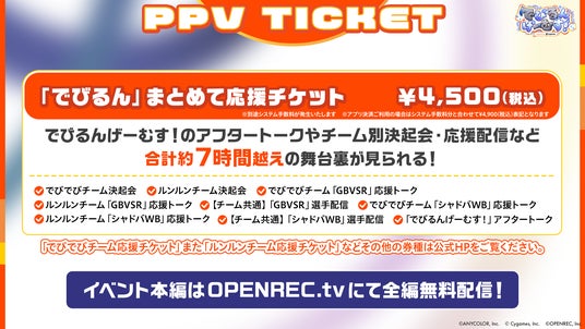 「でびるんげーむす!Supported by Cygames」のアフタートークやチーム別決起会・応援配信など合計約7時間越えの舞台裏が見られるペイ・パー・ビュー(以下、 PPV)チケットを販売中です。