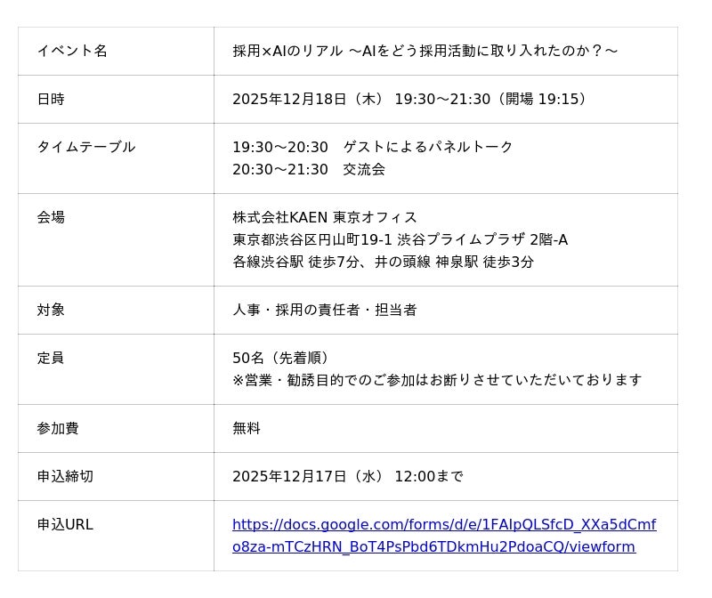 忙しい人事のためのAIスカウトサービス「Scout Base(スカウトベース)」を提供する株式会社KAEN(本社:東京都渋谷区、代表取締役:川田勇輝、以下「当社」)は、2025年12月18日(木)に、採用担当者を対象としたオフライン交流会「採用×AIのリアル ~AIをどう採用活動に取り入れたのか?~」を東京・渋谷オフィスにて開催いたします。 本イベントは、急速に普及するAIツールや採用DXツールについて、実際に現場で運用している担当者が集まり、ツールの導入効果や直面した課題、失敗談などを「本音」で語り合うためのミートアップです。