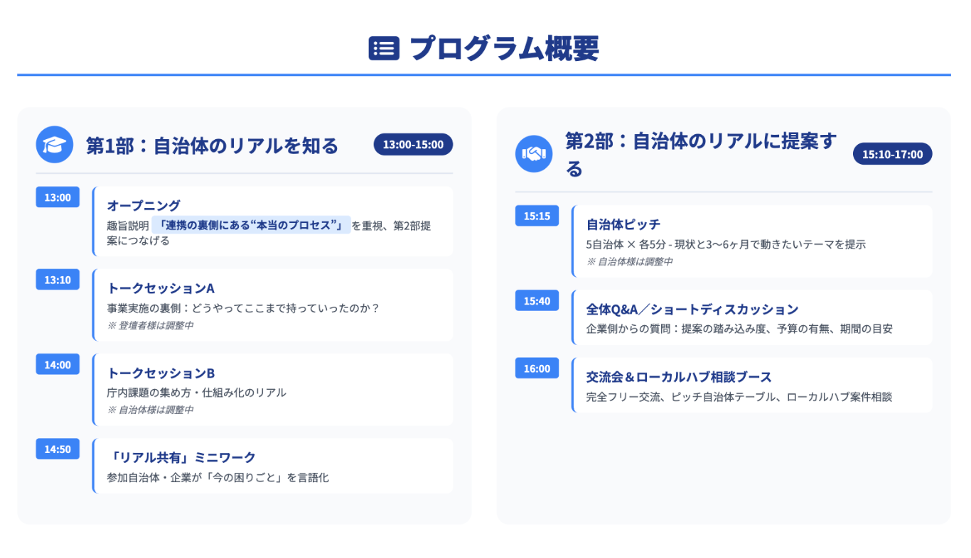 5自治体による 「各自治体の課題/テーマ」 のピッチイベントを実施し、企業が “今すぐ提案できる状態” を作ります。その後は、完全フリーの交流会へ。自治体テーブル・企業テーブルを自由に回遊でき、官民が対話から共創を形づくる時間 を設けます。