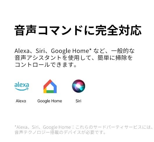 6. 音声コマンドで簡単に掃除Alexa、Siri、Google Homeなど、一般的な音声アシスタントを使用して、簡単に掃除をコントロールできます。