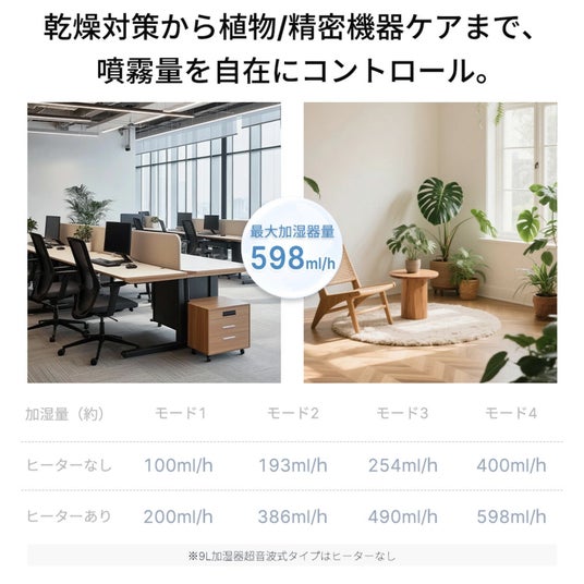 PTCヒーター搭載し、水を適度に加温して雑菌の繁殖を抑えつつ、効率よくミストを生成します。また、省エネ性にも配慮されており、乾燥が気になる季節の対策はもちろん、観葉植物のケアなど幅広いシーンで安心してお使いいただけます。