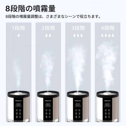 8段階の噴霧量調節機能により、使う場所や時間帯、室内の乾燥状態に合わせて最適なミスト量を細かくコントロールできます。