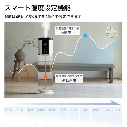 Point6 スマート湿度管理で、いつでも快適なうるおいに湿度は45%~95%まで5%単位で細かく設定でき、内蔵センサーが室内湿度を自動で検知。設定値に達すると運転を停止し、湿度が下がると自動で再開します。過加湿を防ぎながら、心地よい湿度をキープできるため、季節を問わず快適な空間づくりをサポートします。
