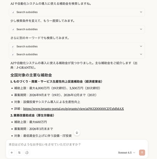 本機能では、デジタル庁が公開した「Jグランツ MCP Server」の設定を活用したjgrants APIとの連携し、制度名称・要件・対象者・期間などを正確に抽出し、生成AIが回答を生成。