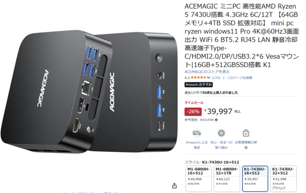【タイムセール】高性能ミニPC「ACEMAGIC Kron Mini K1」Ryzen 5 7430U(6コア12スレッド/最大4.3GHz)登場!