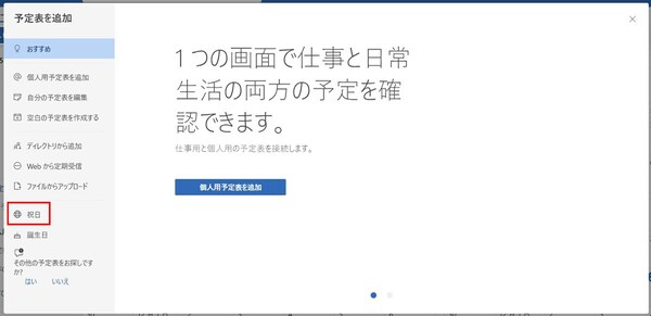 Outlookで「日本の祝日」カレンダーを利用するには、以下の設定が必要です。