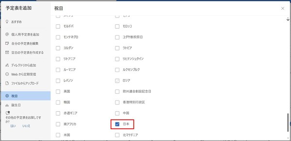 どこの国の祝日を追加するかが表示されますので、「日本」にチェックを入れます。