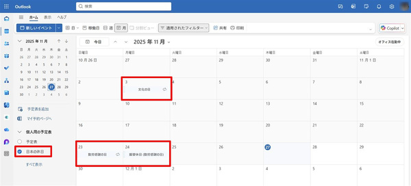 以上の手順で、Outlookの予定表に「日本の祝日」カレンダーが追加されます。