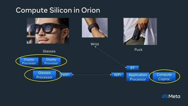 リストバンドはHand tracking/Posingの検出用と考えられる。複数個のカメラやマイクの映像/音声の管理はGlasses Processorが担っている格好で、Glasses ProcessorとApplication Processor/Coprocessorは双方向で結構な量の通信をしていると考えられる。