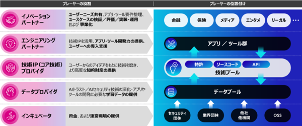 同コンソーシアムでは、さまざまな業界の課題やニーズ、ユースケースを提供するイノベーションパートナー、ユーザーからのアイデアをもとに技術を磨く技術IP(コア技術)プロバイダ、学習データを提供するデータプロバイダ、アプリケーション開発やユーザーへの導入支援を行うエンジニアリングパートナー、資金および運営環境を提供するインキュベータが集い、技術プールを軸としたグローバルコミュニティを構築・提供するとのこと。